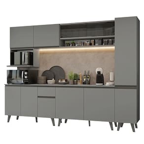 O acabamento cinza, uma tonalidade sofisticada e atemporal, transmite modernidade, adaptando-se a diferentes estilos de decoração. Os puxadores e os pés na coloração titanium são detalhes que valorizam o design.