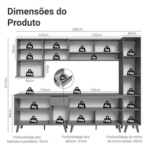 - 52 cm de profundidade nos balcões e paneleiro, 31 cm nos aéreos e 45 cm no nicho para micro-ondas