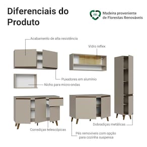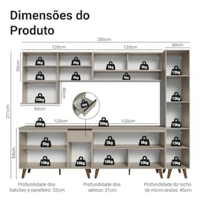 - 52 cm de profundidade nos balcões e paneleiro, 31 cm nos aéreos e 45 cm no nicho para micro-ondas