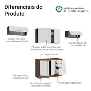 Os armários e balcões foram cuidadosamente projetados para aproveitar ao máximo o espaço. Além disso, os aéreos com porta basculante possuem um sistema de pistão a gás que mantém a porta suspensa quando aberta, proporcionando mais praticidade e segurança no uso diário.