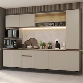 A linha Nice chega em uma nova versão no tom crema, uma tonalidade suave que transmite aconchego e leveza. Outro diferencial está nos puxadores em bronze metalizado, que acrescentam um toque contemporâneo. Com a opção de ser instalada de forma suspensa, essa cozinha oferece um visual ainda mais moderno.