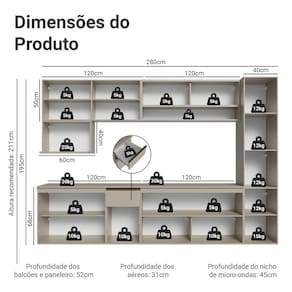 - 52 cm de profundidade nos balcões e paneleiro, 31 cm nos aéreos e 45 cm no nicho para micro-ondas