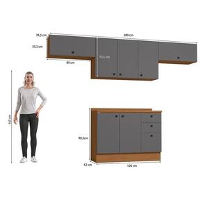 Acabamento: 100% BP / Pintura Touch | Cor: Canela/Cinza Sagrado | Corrediças: Telescópicas | Dobradiça: Com Amortecimento | Garantia: 3 meses para defeito de fabricação | Matéria-prima: MDP / MDP BP | Peso suportado por cada gaveta: 6 Kg | Peso suportado por cada prateleira: 7 kg | Puxadores: Metálicos | Quantidade de gavetas: 3 | Quantidade de portas: 1 / 3 | Quantidade de prateleiras: 1 / 2 | Sistema de montagem: Parafuso Philips / Parafuso Philips e Minifix | Tipo de porta: Bater | Duração da garantia: 3 meses | Tipo de garantia: Garantia do fabricante | Montagem: Necessita montagem | Tipo de móveis de cozinha: Combo de móveis de cozinha | Requer montagem: Sim