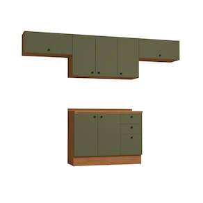 Acabamento: 100% BP / Pintura Touch | Cor: CANELA/VERDE FREVO | Corrediças: Telescópicas | Dobradiça: Com Amortecimento | Garantia: 3 meses para defeito de fabricação | Matéria-prima: MDP / MDP BP | Peso suportado por cada gaveta: 6 Kg | Peso suportado por cada prateleira: 7 kg | Puxadores: Metálicos | Quantidade de gavetas: 3 | Quantidade de portas: 1 / 3 | Quantidade de prateleiras: 1 / 2 | Sistema de montagem: Parafuso Philips / Parafuso Philips e Minifix | Tipo de porta: Bater | Duração da garantia: 3 meses | Tipo de garantia: Garantia do fabricante | Montagem: Necessita montagem | Tipo de móveis de cozinha: Combo de móveis de cozinha | Requer montagem: Sim
