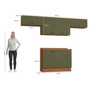 Já as frentes, na cor verde frevo, contam com acabamento fosco em BP, proporcionando maior durablidade contra riscos, arranhões e gotas d'água. Uma combinação aconchegante e moderna, remetendo aos tons da natureza e deixando seu ambiente lindo, incluindo facilidade durante a limpeza. Compacto e funcional, são 2,20m de altura, 2,80m de largura e 52cm de profundidade, perfeito para o estilo minimalista, o combo une o balcão de pia e três aéreos, sendo dois basculantes e um aéreo de pia, uma composição versátil e indispensável para quem procura por funcionalidade.
