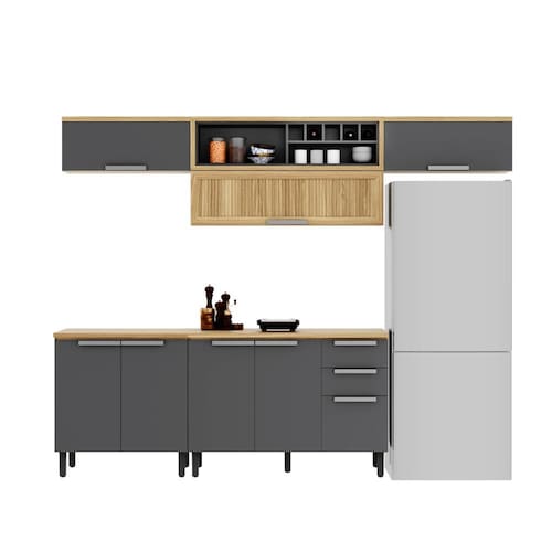 Com 280cm de largura, a composição é versátil e bem distribuída. Inclui: Um armário aéreo de 120cm com uma porta horizontal e nicho aberto, oferecendo fácil acesso a itens do dia a dia.