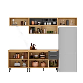 Pensada para diferentes tamanhos de cozinha, a New Porto se adapta tanto a ambientes amplos quanto compactos. Os pés reguláveis garantem fácil nivelamento, enquanto as dobradiças metálicas de 35mm oferecem resistência e estabilidade ao uso diário. Com prateleiras bem distribuídas e soluções inteligentes, como gavetas com divisor de talheres e compartimentos internos, essa cozinha proporciona praticidade, beleza e exclusividade para transformar sua rotina. Informações adicionais: Produto entregue desmontado, com manual de montagem incluso