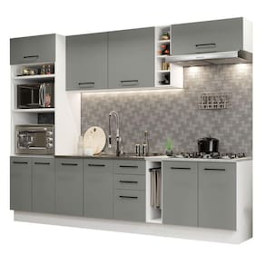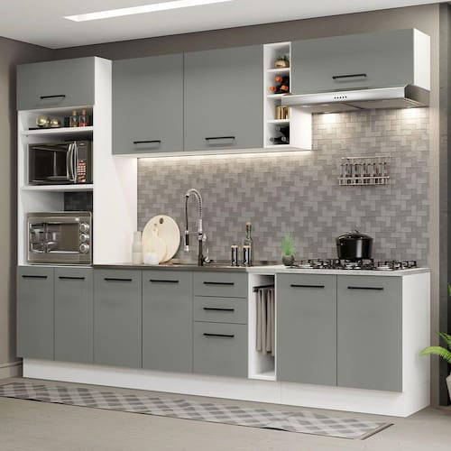 O acabamento da estrutura é branco e o das portas e frentes é cinza. É feito em Pintura Poliéster ecológica, com 7 camadas de proteção resistentes a álcool, água e calor.