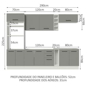 Medidas totais: - 225 cm de altura - 290 cm de largura - 52 cm de profundidade nos módulos inferiores e 31 cm nos aéreos