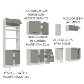 Os materiais utilizados na fabricação são de alta qualidade, como os puxadores com alça em alumínio, as gavetas com corrediças telescópicas de abertura total e as portas com amortecimento para fechamento suave.