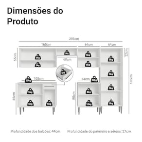 - 44 cm de profundidade nos balcões e 27 cm de profundidade nos aéreos e no paneleiro