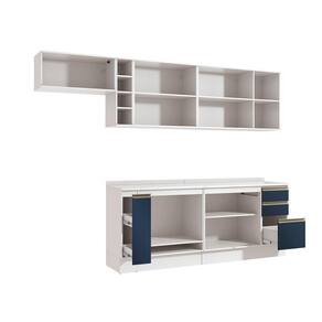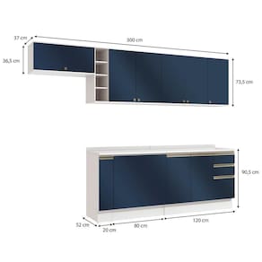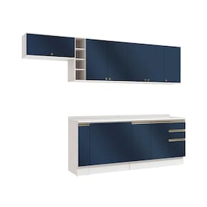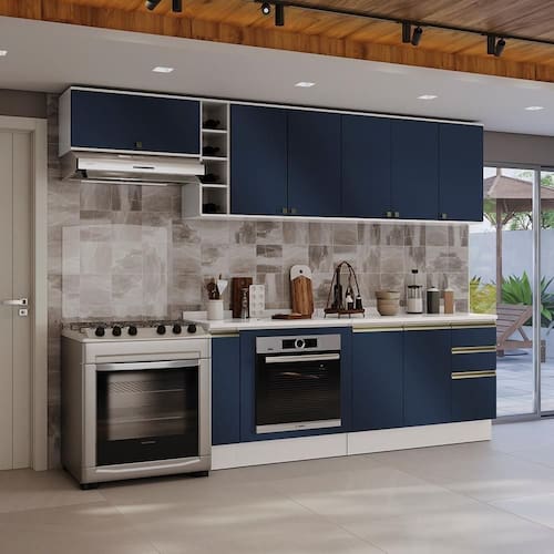 Acabamento: Pintura Brilho / Pintura Fosco / Pintura Touch | Cor: Branco/Azul Profundo | Corrediças: Telescópicas | Dobradiça: Com Amortecimento / Sem Amortecimento | Garantia: 3 meses para defeito de fabricação | Gavetas: Internas | Matéria-prima: MDF / MDP | Medidas internas: 65 x 40 cm | Peso suportado por cada gaveta: 6 Kg | Peso suportado por cada prateleira: 7 kg | Peso suportado por gaveta: 6 kg | Puxadores: Alumínio / Metálicos / Puxadores de Metal e de Alumínio | Quantidade de gavetas: 2 / 3 | Quantidade de portas: 1 / 2 / 3 | Quantidade de prateleiras: 1 / 2 / 5 | Sistema de montagem: Parafuso Philips | Tipo de porta: Bater | Duração da garantia: 3 meses | Tipo de garantia: Garantia do fabricante | Montagem: Necessita montagem | Tipo de móveis de cozinha: Combo de móveis de cozinha | Requer montagem: Sim