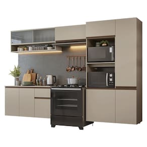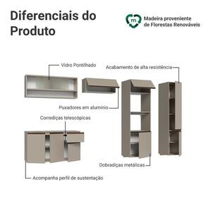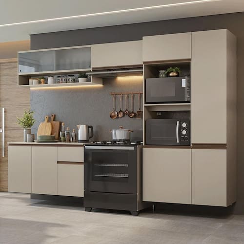 A Cozinha Completa de 300 cm é ideal para quem busca praticidade. O destaque vai para o paneleiro com duas portas e cinco nichos. Os módulos são suspensos, garantindo um visual leve e facilitando a limpeza.