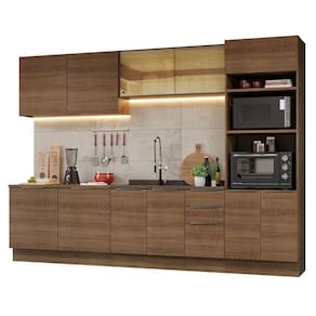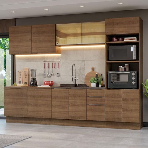 O conjunto é composto por módulos avulsos, que podem ser personalizados de acordo com o tamanho e a configuração do seu espaço. Isso permite que você crie uma cozinha planejada, que atenda às suas necessidades.