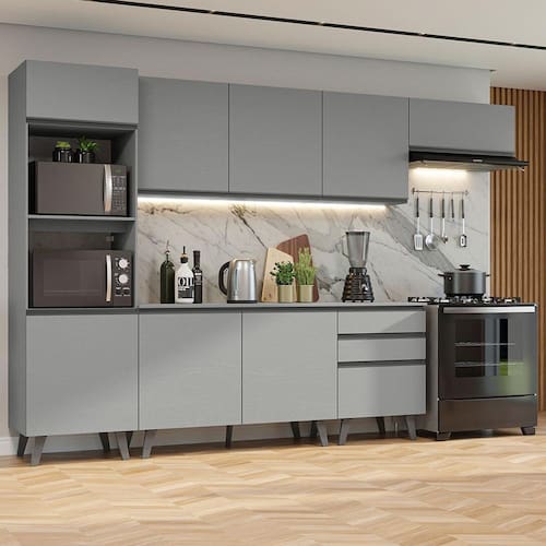 Para completar, o acabamento da cozinha é cinza, feito em Pintura Poliéster ecológica, que oferece proteção contra os efeitos da água e do calor.