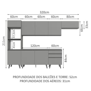 - 52 cm de profundidade nos balcões e na torre e 31 cm nos aéreos