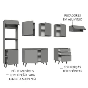 A construção é feita com com itens de alta qualidade. São puxadores em alumínio na coloração titanium, corrediças telescópicas para abertura total das gavetas e dobradiças metálicas nas portas.