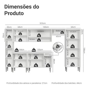 - 44 cm de profundidade nos balcões e 27cm nos aéreos/paneleiro