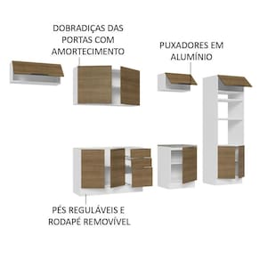 Possui puxadores em alumínio no modelo slim, gavetas com corrediças telescópicas de abertura total e portas com amortecimento para fechamento suave. Além disso, os pés são reguláveis em PVC, com rodapé removível de MDP.