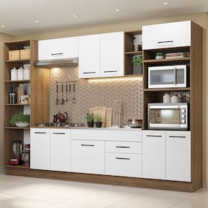 Com muito espaço disponível, conta com diversas gavetas, prateleiras e nichos. Assim, fica mais fácil fazer a organização da cozinha. O balcão maior tem espaço para pia de inox ou pedra nas medidas de 120 x 52 cm. O balcão de 80 cm possui tampo, que pode ser recortado para instalação de cooktop.