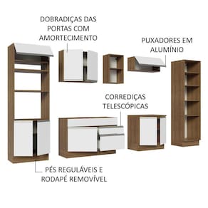 A fabricação da cozinha é feita com puxadores em alumínio, gavetas com corrediças telescópicas de abertura total, portas com fechamento suave e pistão a gás para as portas basculantes. Todos estes detalhes aumentam a durabilidade e conservam a beleza do móvel por muito mais tempo.