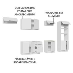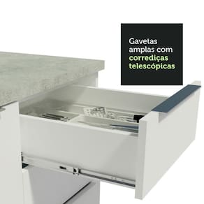 Possui puxadores em alumínio no modelo slim, gavetas com corrediças telescópicas de abertura total e portas com amortecimento para fechamento suave. Além disso, os pés são reguláveis em PVC, com rodapé removível de MDP.