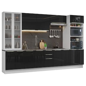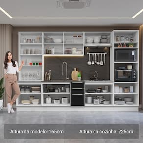 Fabricada com padrão de qualidade superior, a cozinha conta com vidro incolor sobreposto nas frentes e portas. Além disso, os puxadores são em alumínio, as gavetas abrem totalmente e as portas possuem amortecimento para fechamento suave.