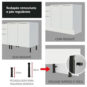 Com ampla capacidade de armazenamento, essa cozinha oferece espaço suficiente para acomodar muitos utensílios e eletros, como forno, micro-ondas, louças, panos e muito mais. Além disso, o balcão tem capacidade para pias de 120 cm x 52 cm e todos os módulos inferiores possuem pés reguláveis em PVC, além de rodapé removível em MDP de encaixe rápido.