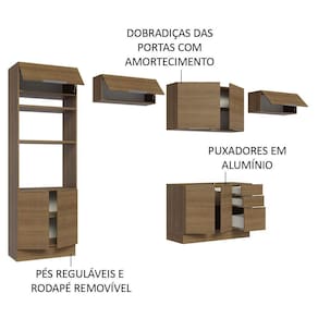Com ampla capacidade de armazenamento, essa cozinha oferece espaço suficiente para acomodar muitos utensílios e os eletros. Além disso, o balcão tem capacidade para pias de 120 cm x 52 cm e todos os módulos inferiores possuem pés reguláveis em PVC, além de rodapé removível em MDP