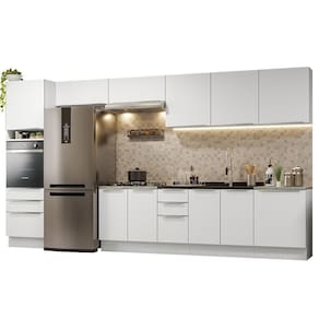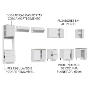 Composta por materiais de muita qualidade, a cozinha possui puxadores em alumínio, gavetas com corrediças telescópicas, amortecedores para o fechamento suave das portas, pistão a gás para a abertura das portas basculantes e pés reguláveis em PVC, com rodapés removíveis em MDP.