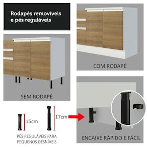 Um dos grandes destaques é a fabricação feita 100% em MDF, material ecologicamente correto e que proporciona uma ótima durabilidade ao móvel. Além disso, possui puxadores em alumínio, corrediças telescópicas, dobradiças metálicas e pés reguláveis em PVC, com rodapé removível em MDF.
