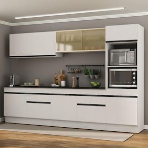 O Armário de Cozinha Completa 5 peças com Rodapé MP2175 Made Multimóveis é produzido em MDP 12/15mm com acabamento acetinado (cerca de 20% de brilho), garantindo maior durabilidade e resistência. Com 10 portas (incluindo 2 de correr em vidro reflecta e 3 basculantes), prateleiras e 2 gavetas com corrediças metálicas (mais leveza no manuseio), você terá amplo espaço interno para armazenar todos os seus itens de cozinha. Os módulos são individuais, podendo ser montados de acordo com a sua necessidade. Versátil e funcional, este conjunto conta com 2 balcões com tampos removíveis (compatíveis com pias de 120cm), módulo para forno e micro-ondas, compartimento especial para utensílios mais altos, além de puxadores em ABS e rodapés que adicionam estilo ao ambiente. Esta é uma excelente escolha para tornar sua cozinha completa e elegante!