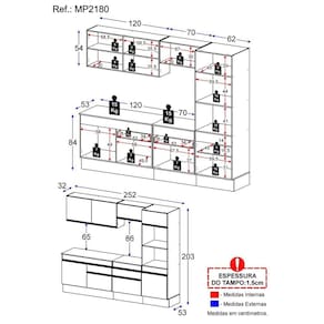 Conteúdo da Embalagem: 1 (um) Armário Aéreo 120cm 1 (um) Balcão com Tampo 120cm 1 (um) Armário Aéreo com Porta Basculante 70cm 1 (um) Balcão com Tampo 70cm 1 (um) Armário para Forno e Micro-Ondas 62cm