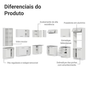 Possui puxadores com alça em alumínio e gavetas com corrediças telescópicas de abertura total. As portas contam com amortecimento para fechamento suave.