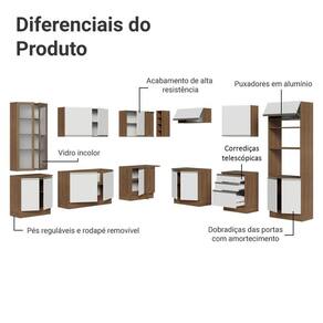 O móvel é equipado com puxadores em alumínio e gavetas com corrediças telescópicas, que abrem totalmente. Já as portas possuem amortecimento, proporcionando um fechamento suave, enquanto os pés em PVC contam com regulagem de altura.