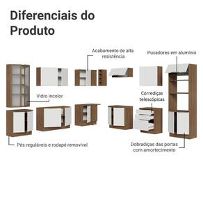 O móvel é equipado com puxadores slim em alumínio e gavetas com corrediças telescópicas, que abrem totalmente. Já as portas possuem amortecimento, proporcionando um fechamento suave.