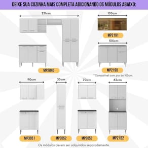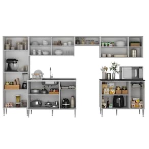 O Armário de Cozinha Completa 6 Pçs com Balcão Gabinete Siena Multimóveis MP2243 é produzido em MDP (15mm) com acabamento acetinado (cerca de 20% de brilho), garantindo durabilidade e facilidade na limpeza. É composto por 6 módulos individuais que podem ser montados da forma que melhor se adaptarem ao seu espaço. Com amplo espaço interno para acomodar itens de cozinha, até mesmo aqueles mais altos, possui 13 portas, 2 gavetas com corrediças telescópicas (manuseio suave e silencioso), dobradiças metálicas, puxadores em ABS com acabamento cromado e pés em polipropileno com regulagem de altura. As portas de correr em vidro reflecta oferecem elegância e praticidade no dia a dia. As portas e gavetas são embutidas, proporcionando um visual de cozinha planejada. Além disso, esta cozinha conta com espaço para fogão/geladeira e 2 balcões com tampo removível (apenas 1 dos balcões é com pia de 105cm).