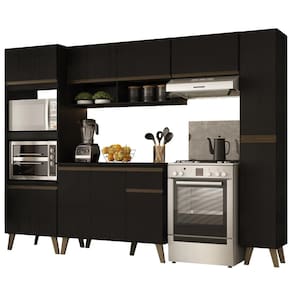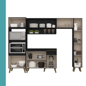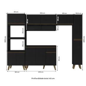 Composta por três módulos versáteis, conta com uma torre quente para dois fornos, um armário aéreo de duas portas e nicho incluso, um armário aéreo de 60cm, um balcão de 105cm com gaveteiro e um paneleiro de 2 portas. Equipada com puxadores e pés em ABS, dobradiças e corrediças metálicas e elaborada em MDP de alta qualidade, essa cozinha oferece durabilidade, resistência e sofisticação em cada detalhe!