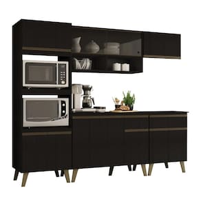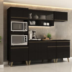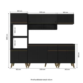 Composta por três módulos versáteis, conta com um armário aéreo de duas portas de vidro e nicho incluso, um armário aéreo de 60cm, um balcão de 105cm com gaveteiro, um balcão de 60cm com uma gaveta e 2 portas e uma torre quente com espaço para dois fornos. Equipada com puxadores e pés em ABS, dobradiças e corrediças metálicas e elaborada em MDP de alta qualidade, essa cozinha oferece durabilidade, resistência e sofisticação em cada detalhe!