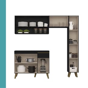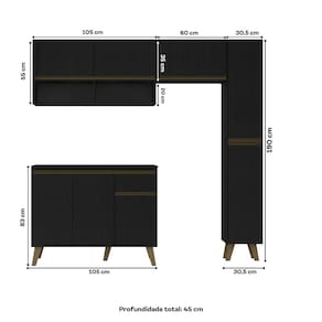 Composta por dois módulos versáteis, conta com um armário aéreo de duas portas e nicho incluso, um armário aéreo de 60cm, um balcão de 105cm com gaveteiro e um paneleiro. Equipada com puxadores e pés em ABS, dobradiças e corrediças metálicas e elaborada em MDP de alta qualidade, essa cozinha oferece durabilidade, resistência e sofisticação em cada detalhe!