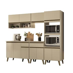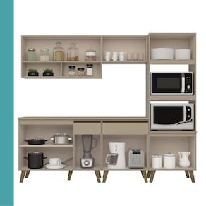 Composta por três módulos versáteis, conta com um armário aéreo de duas portas e nicho incluso, um armário aéreo de 60cm, um balcão de 105cm com gaveteiro, um balcão de 60cm com 1 gaveta e 2 portas e uma torre quente para dois fornos. Equipada com puxadores e pés em ABS, dobradiças e corrediças metálicas e elaborada em MDP de alta qualidade, essa cozinha oferece durabilidade, resistência e sofisticação em cada detalhe!