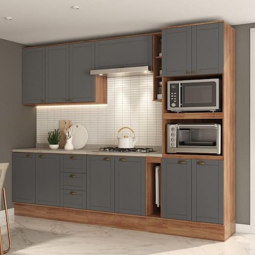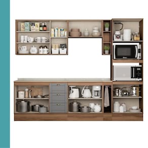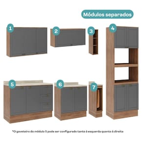 A Cozinha Milla Dreamer lembra as cozinhas tradicionais, com detalhes especiais em frisos e puxadores – porém, tudo em uma simplicidade visual. Possui 7 módulos, entre eles aéreo com 3 portas 1200 mm, balcão com 1200 mm, aéreo basculante de 800 mm e torre quente com espaço para armazenamento de forno e microondas, balcão de 800 mm, nichos aéreos para armazenar temperos ou decorações e porta toalhas! Conta também com puxadores em metal no acabamento “ouro velho” e matéria-prima em BP e MDF, criando uma harmonia fantástica com os demais itens dentro do espaço em que a cozinha está inserida.