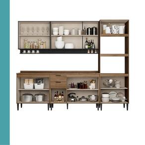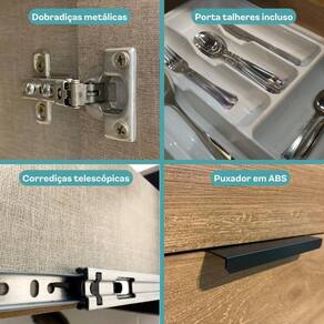 A Cozinha Lotus Star é cheia de conceito integrando muitas prateleiras e espaços para organização. O mix de texturas e acabamentos em MDP trazem a modernidade do estilo industrial novaiorquino, fazendo a sua área gourmet ser o centro das atenções. Possui 5 módulos, entre eles aéreo com 3 portas, balcão com 1200 mm, aéreo de 800 mm, balcão de 800 mm e uma torre quente com espaço para armazenar forno e microondas. Conta também com puxadores resistentes em ABS, as dobradiças metálicas e as corrediças telescópicas, garantem durabilidade e resistência em sua cozinha, além dos pés que possuem regulagem de altura.