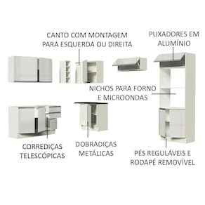 O acabamento da estrutura é branco fosco e as portas e frentes são em branco brilho. É feito em Pintura Poliéster de alta resistência, que confere maior durabilidade e qualidade ao móvel.