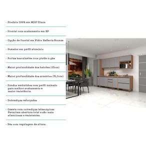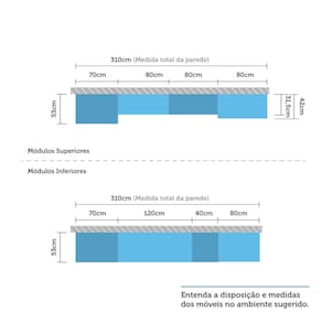 Uma cozinha modulada completa, para deixar seu ambiente super aconchegante e requintado. Composta por 7 peças cuidadosamente pensadas para sua organização. As portas embutidas remetem ao planejado, com acabamento impecável. Os módulos são montados individualmente e permite a instalação da forma que melhor se adeque ao seu espaço. Contém um nicho com espaço para forno micro-ondas e despenseiro. Para este ambiente utilizamos como proposta 310cm de parede linear.