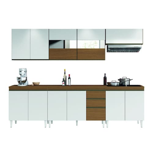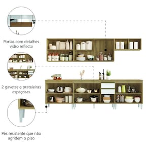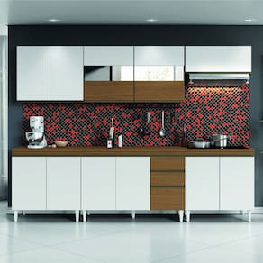 O Armário de Cozinha Completa Clara possui design versátil e multifuncional, perfeito para sua cozinha ou área gourmet! Composto por um amplo armário aéreo com portas em detalhe reflecta, e armário com porta basculante com pistão a gás para melhor aproveitamento de espaço. Acompanha balcão com tampo espaçoso, ideal para quem deseja praticidade e funcionalidade em qualquer ambiente e ainda conta com pés em material resistente que não agridem o piso.