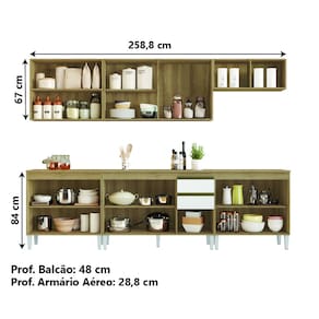 MEDIDAS: [ A ] = 84 cm (Balcões) / 67 cm (Armários Aéreos) [ L ] = 258,8 cm [ P ] = 48 cm (Balcões) / 28,8 cm (Armários Aéreos) PESO: 127, 04kg ARMÁRIO AÉREO SUPORTA ATÉ: 10kg BALCÃO SUPORTA ATÉ: 35kg PESO SUPORTADO PRATELEIRAS: 5kg Características MODELO: Armário de Cozinha Completa com Balcão 12 Portas 2 Gavetas Clara Aramóveis MARCA: Aramóveis COR: Atacama / Branco MATERIAL DA ESTRUTURA: MDP ACABAMENTO: Fosco / Brilho PORTAS: 12 GAVETAS: 2 TIPO DE PORTA: Bater / Basculante (Armário Aéreo) DOBRADIÇAS: Metálicas CORREDIÇAS: Metálicas PRATELEIRAS: 11 MATERIAL DOS PUXADORES: Plástico PÉS: 13 MATERIAL DOS PÉS: Plástico TIPO DE PUXADORES: Embutidos POSSUI VIDRO: Vidro Reflecta GARANTIA: 3 meses