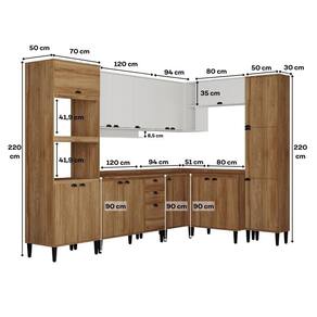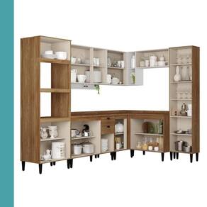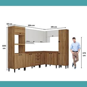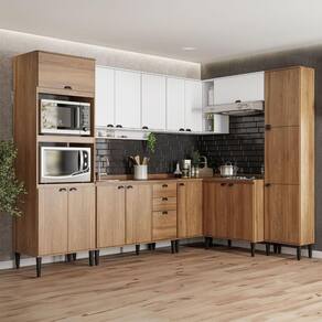 Feito em MDP, o conjunto possui 8 módulos, incluindo uma torre quente para 2 fornos, paneleiro com duas portas de giro e vidro canelado, aéreo com 1 porta basculante, balcão sem tampo com 2 portas e 3 gavetas permitindo personalizar com o tampo de sua escolha, aéreo com 2 portas, balcão e aéreo de canto e balcão com 2 portas de giro.