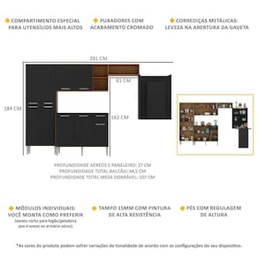 Dimensões do produto montado: Altura: 184cm - Largura: 291cm - Profundidade: 27cm (aéreos e paneleiro) - 44,5cm (balcão com tampo) Espaço do nicho para fogão/geladeira - Altura: 162cm - Largura: 61cm *Você pode consultar as medidas internas na imagem técnica do produto.