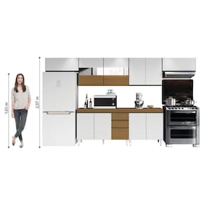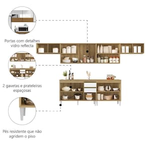 O Armário de Cozinha Completa Clara possui design versátil e multifuncional, perfeito para sua cozinha ou área gourmet! Composto por um amplo armário aéreo com portas em detalhe reflecta, e armário com porta basculante com pistão a gás para melhor aproveitamento de espaço, que pode ser sobre geladeira ou sobre o depurador do fogão. Possui excelente espaço para acomodar copos, xicaras, pratos e demais utensílios domésticos. Acompanha balcão com tampo espaçoso ideal para quem deseja praticidade e funcionalidade em qualquer ambiente, e ainda conta com pés em material resistente que não agridem o piso.